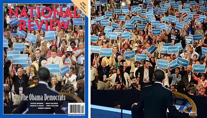 In questa foto uno dei tanti inganni della fotografia usati in ambito politico: la folla di fronte al presidente Barack Obama sventola cartelli con la parola “abortion”, ma nella versione non modificata della foto la scritta era un po’ diversa…